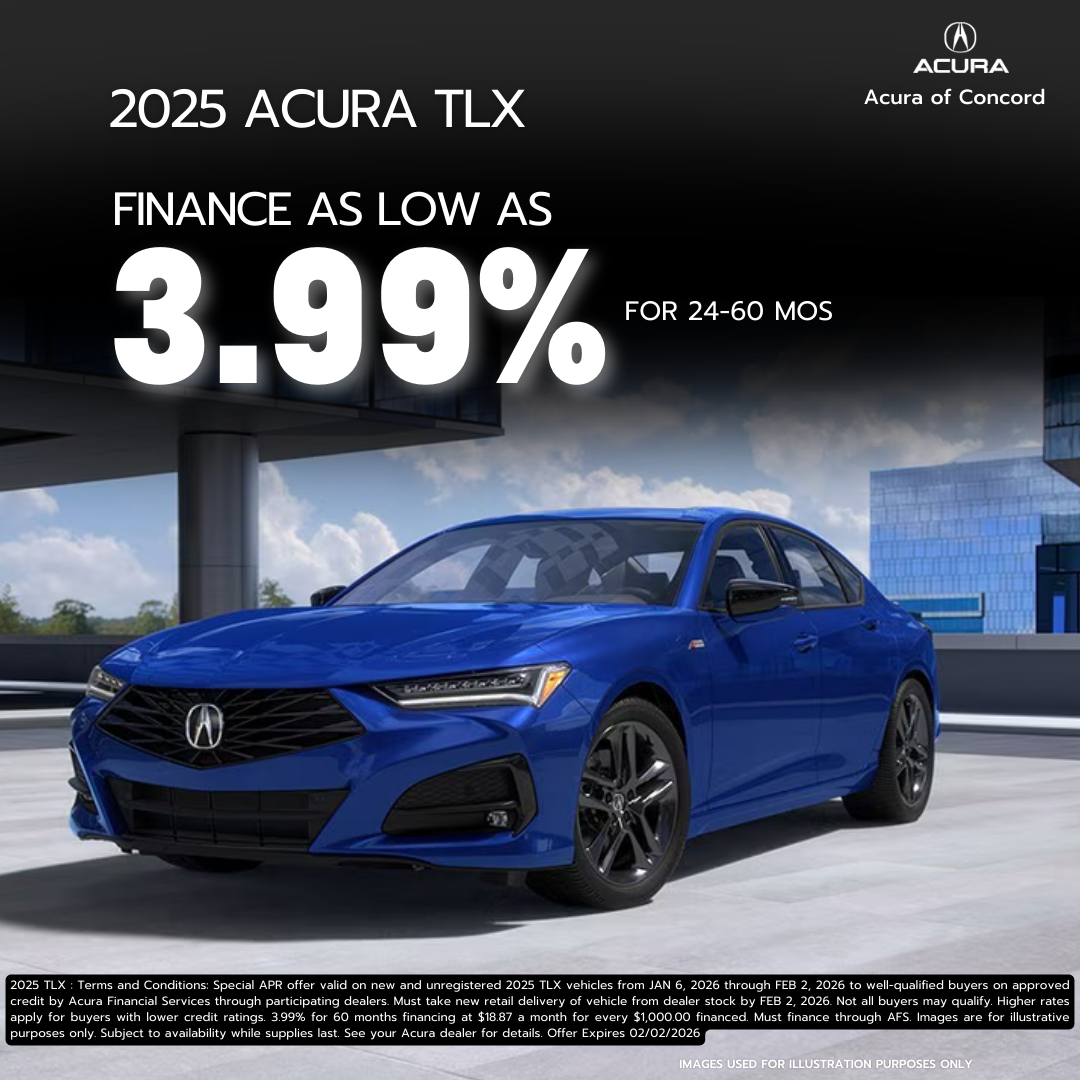 2025 TLX : Terms and Conditions: Special APR offer valid on new and unregistered 2025 TLX vehicles from JAN 6, 2026 through FEB 2, 2026 to well-qualified buyers on approved credit by Acura Financial Services through participating dealers. Must take new retail delivery of vehicle from dealer stock by FEB 2, 2026. Not all buyers may qualify. Higher rates apply for buyers with lower credit ratings. 3.99% for 60 months financing at $18.87 a month for every $1,000.00 financed. Must finance through AFS. Images are for illustrative purposes only. Subject to availability while supplies last. See your Acura dealer for details. Offer Expires 02/02/2026